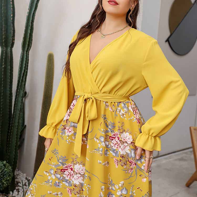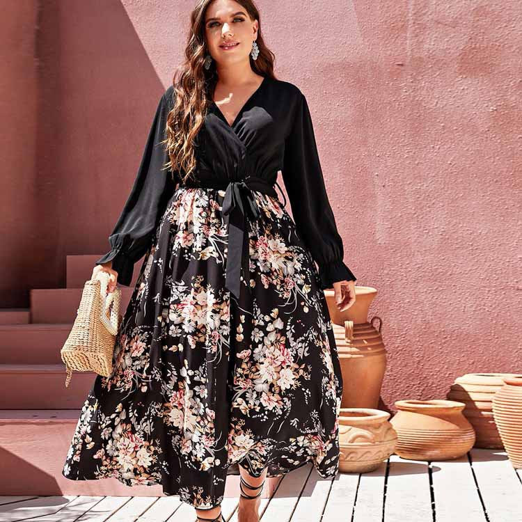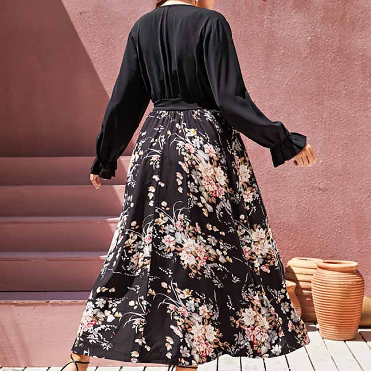 Denne smukke blomstrede maxi kjole kombinerer elegance og komfort med sit omslagsdesign og flatterende bindetalje. De lange ærmer og det livlige print gør den perfekt til enhver lejlighed, fra afslappede brunches til festlige aftener.